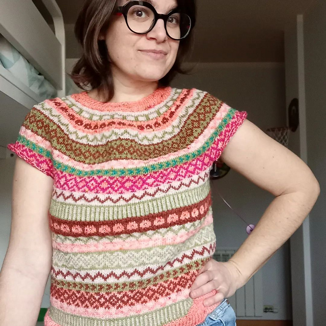 Me está dando una pereza infinita empezar las mangas. Me da miedo quedarme sin lana y que no haya acabado de dar con la combinación de colores. Miedo a que llegue el buen tiempo y siga con los cabos por esconder. Miedo a que destiña la lana fucsia que añadí al canesú... Esa suma de "miedos" que en realidad son excusas. ¡Cómo si tuviera que rendir cuantas con alguien de lo que tejo o dejo de tejer!